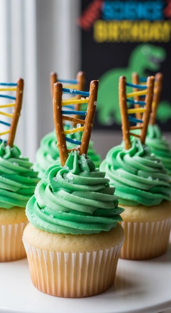 Moving beyond fierce predator designs, DNA-inspired cupcakes bring a scientific twist that’ll fascinate budding paleontologists at your party. These dino themed layered cupcakes feature lively green frosting swirled in double-helix patterns that mimic genetic strands.