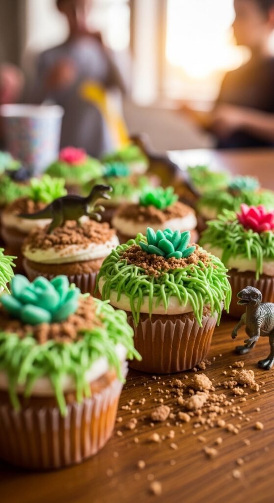 Top each cupcake with miniature plastic dinosaurs grazing peacefully among candy succulents. I love using green frosting piped through grass tips to create realistic texture. Add crushed Oreos around the edges, then place tiny succulent plant pots and miniature garden accessories like wooden fences or pebble paths.