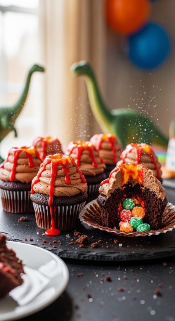 These volcano cupcakes pair perfectly with other prehistoric party elements to create a truly roaring celebration that transports kids back to the age of dinosaurs.