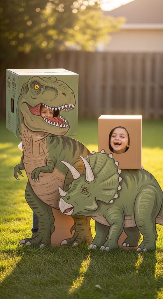Large cardboard appliance boxes transform into incredible dinosaur standees with minimal effort. Sketch your favorite prehistoric creatures directly onto the cardboard, then cut out the shapes using a utility knife. Paint them in vivid greens, browns, and oranges for maximum impact.