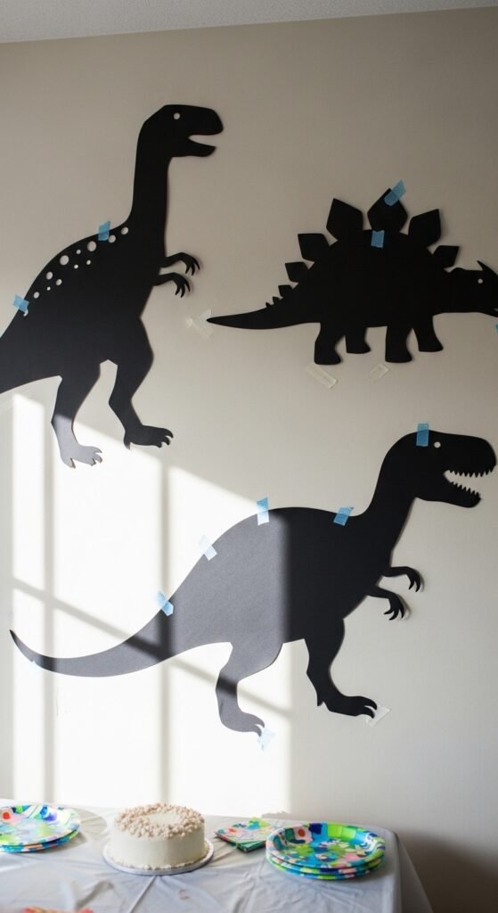 You’ll find dinosaur silhouette templates online for free, or sketch your own T-Rex, Triceratops, and Stegosaurus shapes. I recommend using black construction paper since it creates the most dramatic effect against lighter walls.