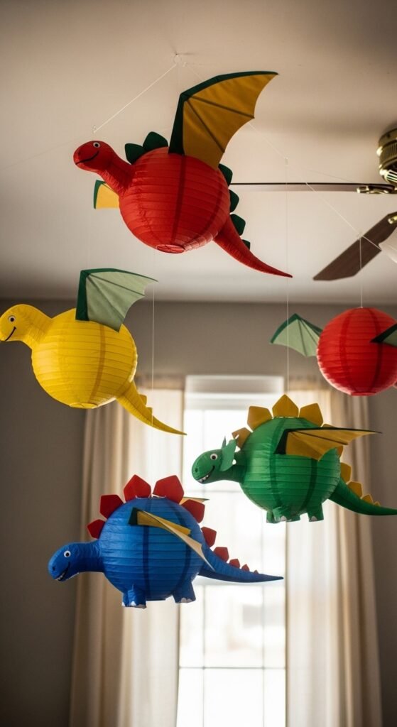 I recommend creating unique lantern color combinations like teal and orange, purple and lime green, or classic red and yellow. Simply attach paper wings, tails, and heads using double-sided tape. Hang them at varying heights with fishing line for a lively aerial display that adds magical movement to your prehistoric party atmosphere. These flying dinosaur decorations work perfectly as dinosaur centerpiece alternatives when hung low over your party table.