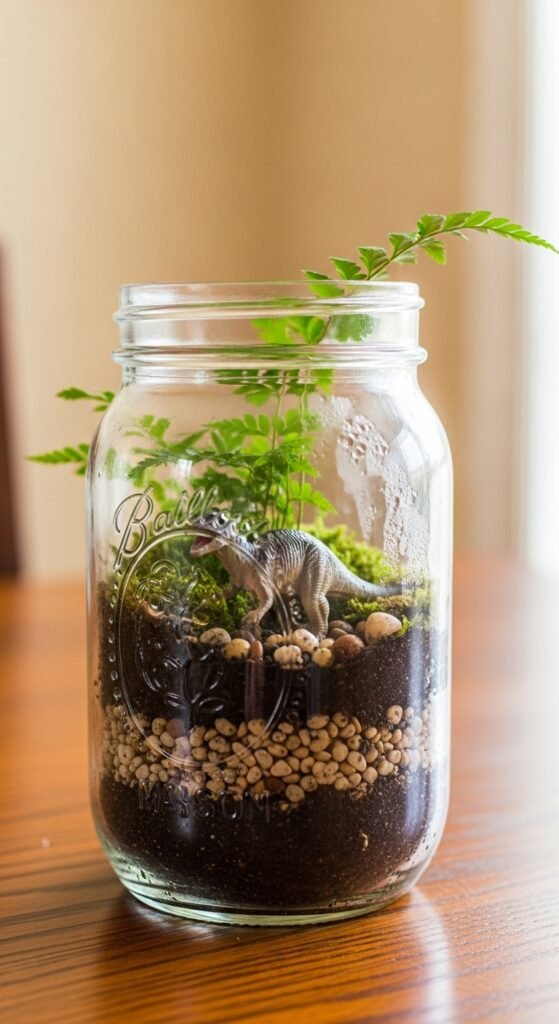 Start with wide-mouth mason jars—they’re easier to work with. Layer small pebbles for drainage, then add potting soil. Here’s where it gets fun: create moss based terrain by pressing sheet moss into hills and valleys. Small ferns and succulents work perfectly as prehistoric plant accents.