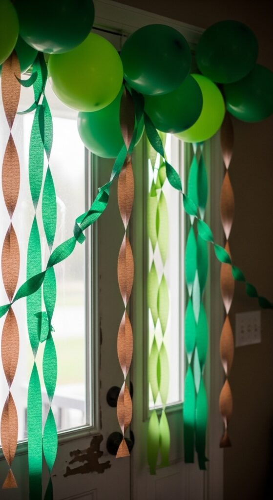 Start with green and brown crepe paper streamers. Twist two different shades together, then wrap them around doorframes, ceiling fixtures, and table edges. The secret? Don’t make them perfect—real twisted vines have irregular bumps and curves.