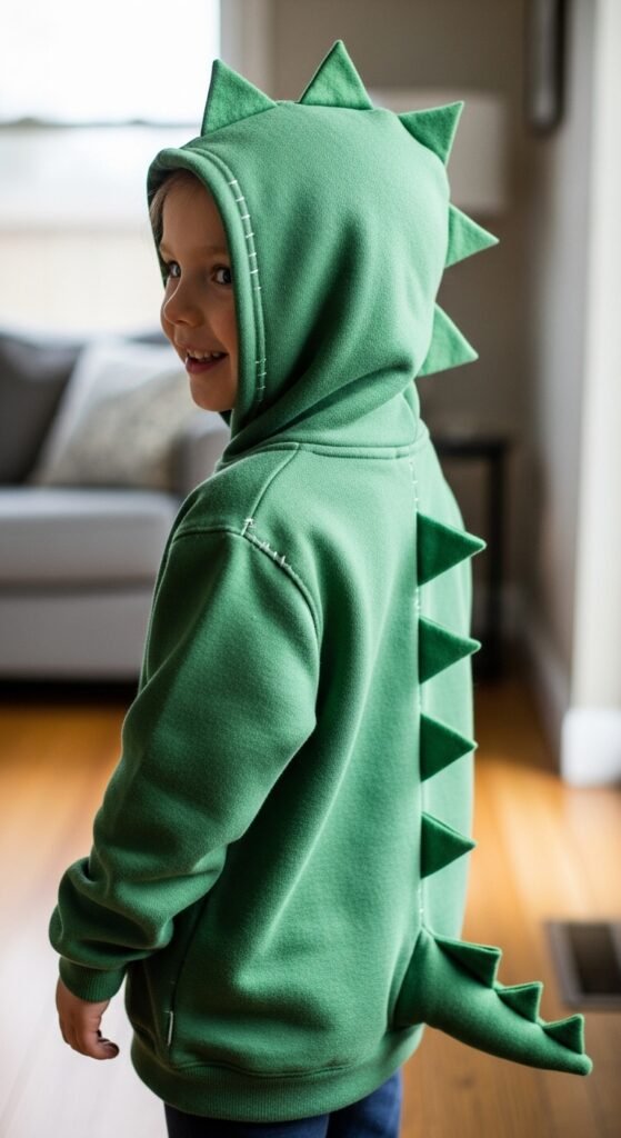 Start with a plain hoodie in your child’s favorite dinosaur color. The felt texture works perfectly for creating realistic spikes – simply cut triangular shapes and hand-stitch them along the hood and down the back. These homemade details make all the difference.