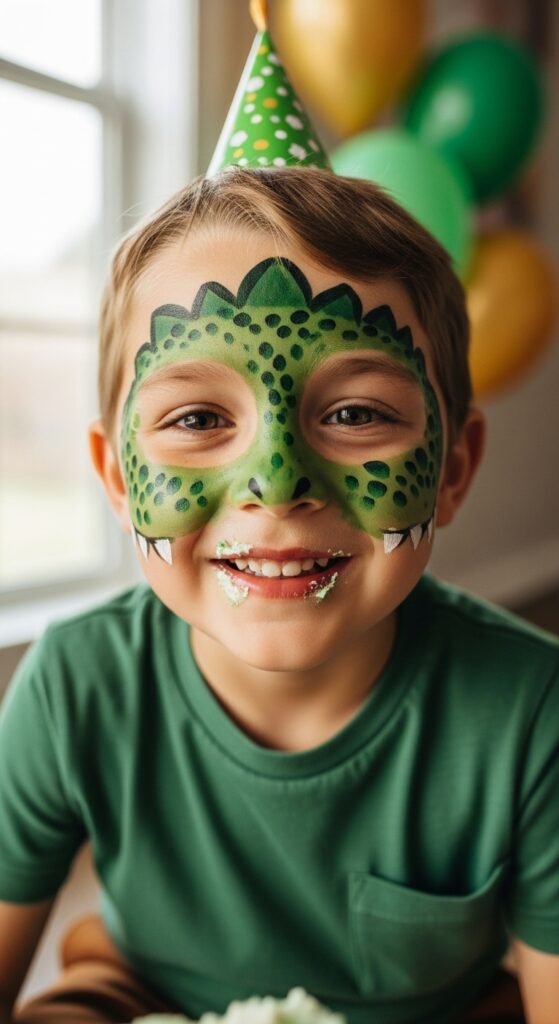 Although elaborate costumes grab attention, sometimes the most memorable dinosaur metamorphoses come from the simplest approach—a splash of face paint and strategic color choices.