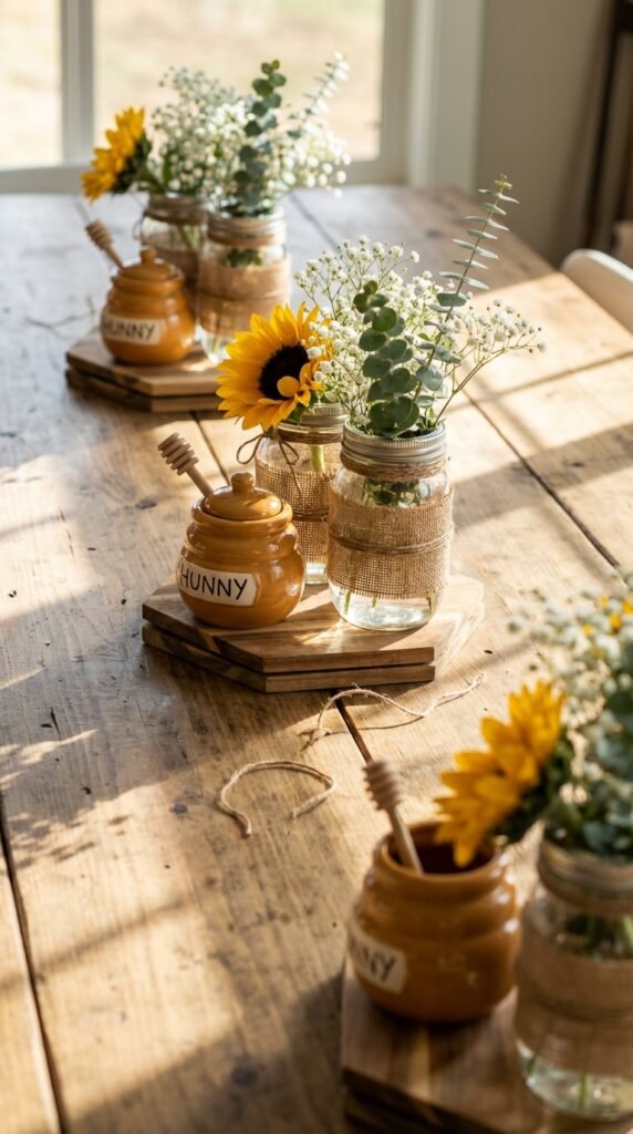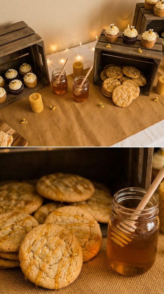 Start with honey infused cupcake displays arranged on vintage wooden crates. I’ve found mason jars filled with honey create perfect centerpieces while doubling as party favors.