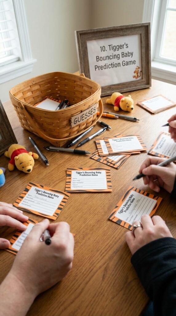 This bouncing guessing game works beautifully as a shower prediction activity because it captures Tigger’s playful spirit while engaging everyone. I’ve found that adding quirky questions like “Baby’s first word?” or “Who will baby look like?” sparks hilarious conversations. Display completed cards in a decorative basket, then present them to the parents-to-be as a cherished keepsake.
