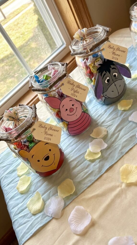 Mason jars convert into enchanting Winnie the Pooh decorations with just a few brushstrokes and some creative vision. You’ll paint Pooh’s honey-colored face on one jar, Piglet’s pink cheeks on another, and Eeyore’s gray ears on a third.