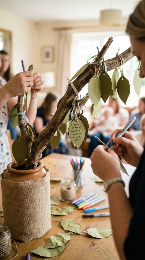 Wishes tree personalization works best when you provide prompt cards like “I hope baby’s first word is…” or “May you always remember…” Guests write handwritten wish notes on leaf-shaped cards, then hang them using ribbon or twine.