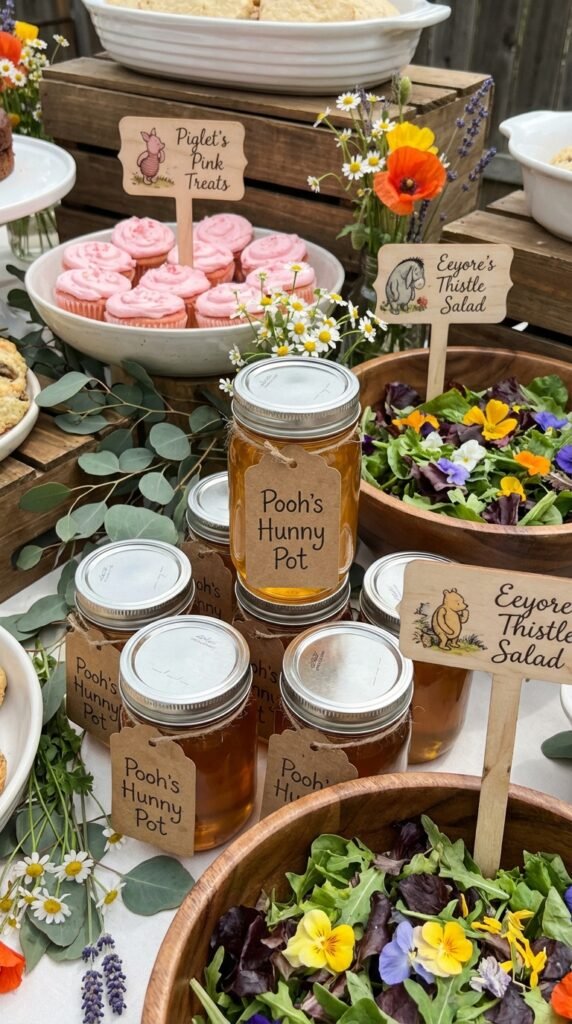 Design hundred acre wood signage pointing to different food stations: “Pooh’s Hunny Pot,” “Piglet’s Pink Treats,” or “Eeyore’s Thistle Salad.” Use wooden stakes and weathered fonts to mimic classic storybook illustrations. These simple touches create an immersive experience that’ll have guests feeling like they’ve stepped into Christopher Robin’s magical world.