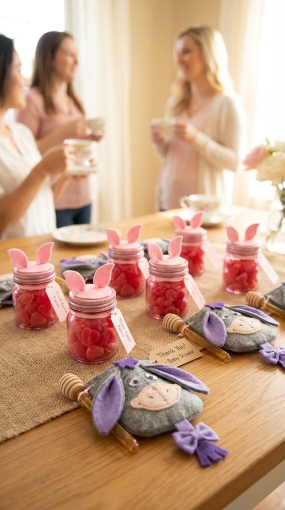 Whip up these adorable handmade favors that’ll have guests melting over Piglet’s sweetness and Eeyore’s lovable grumpiness. Create adorable piglet inspired favors by filling pink mini mason jars with strawberry candies, then tie on fabric ears and curly pipe cleaner tails.