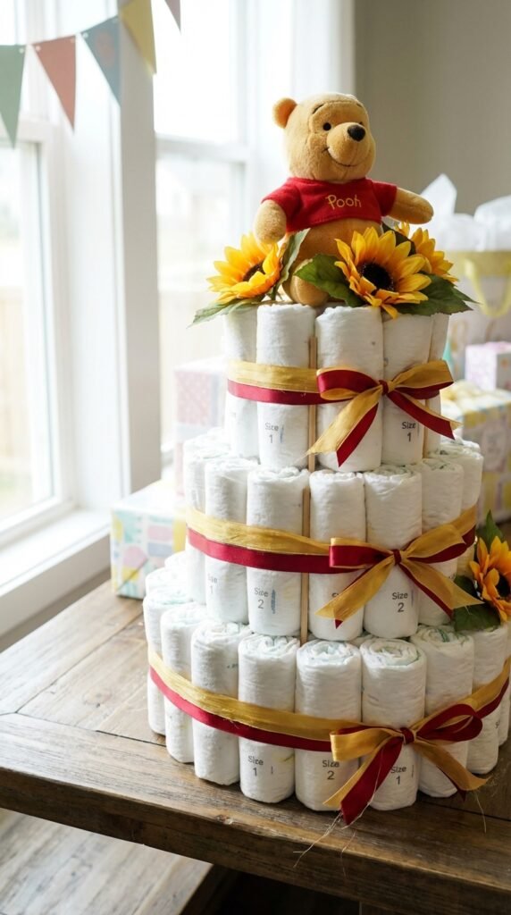 Beyond sweet treats, crafting a Winnie the Pooh diaper cake creates an adorable centerpiece that’s both decorative and practical for the expecting parents.