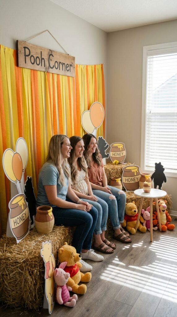 Set up your custom photo booth against a simple backdrop of yellow and orange streamers. Add a wooden “Pooh Corner” sign and scatter some stuffed animals around. Your guests will snap adorable memories that perfectly capture this sweet celebration.