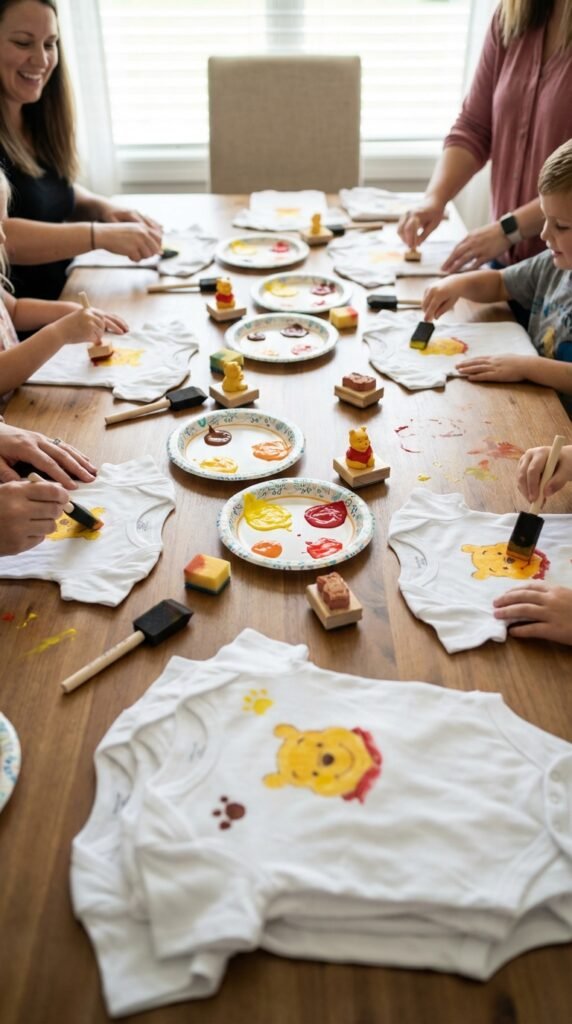 Set up a fun stamp station with Pooh-themed rubber stamps featuring honey pots, bees, and character silhouettes. I recommend using fabric ink pads since they’re washable and safe for baby’s delicate skin.