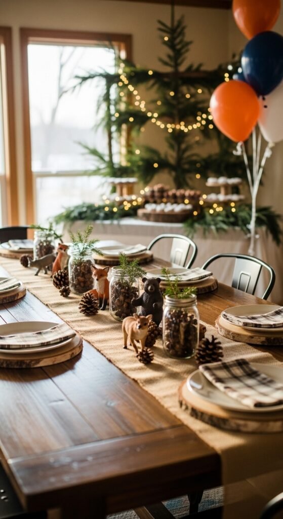 Picture this: burlap table runners paired with mason jar centerpieces filled with acorns and pinecones. You’ll want to scatter woodland animal figurines—think foxes, bears, and deer—across your tables for that authentic forest feel.