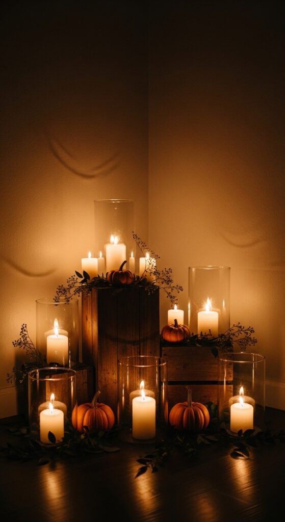 Choose seasonal scents like cinnamon apple, pumpkin spice, or vanilla bourbon to fill your space with warmth. I’ve found that placing candles at varying heights creates visual interest—try pillar candles on wooden blocks alongside tea lights in mason jars.