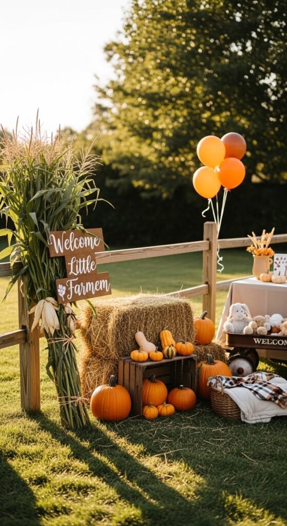 Don’t forget orange and brown balloons, burlap table runners, and wooden “Welcome Little Farmer” signs to complete the authentic harvest atmosphere.