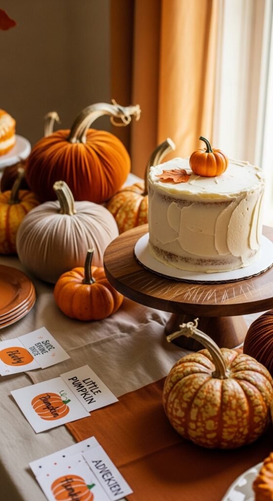 For pumpkin themed activities, set up a “guess the baby food” station using orange pureed foods, or create pumpkin-shaped advice cards where guests write parenting tips for the new parents.