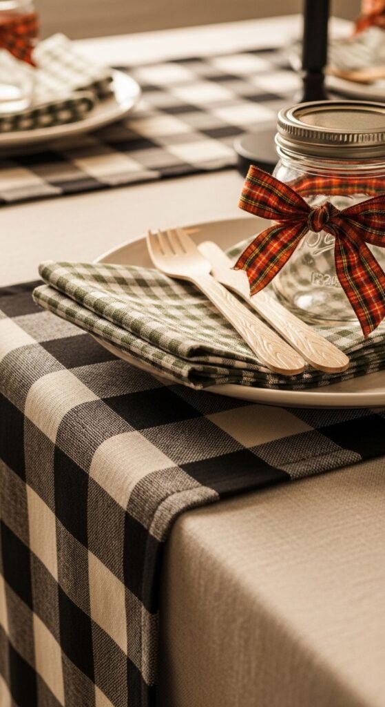 I love layering different plaid sizes – think small gingham napkins with larger buffalo check accents. These cozy autumn textures add instant warmth to any space. Try plaid ribbon around mason jar centerpieces or wrap utensils in plaid fabric napkins.