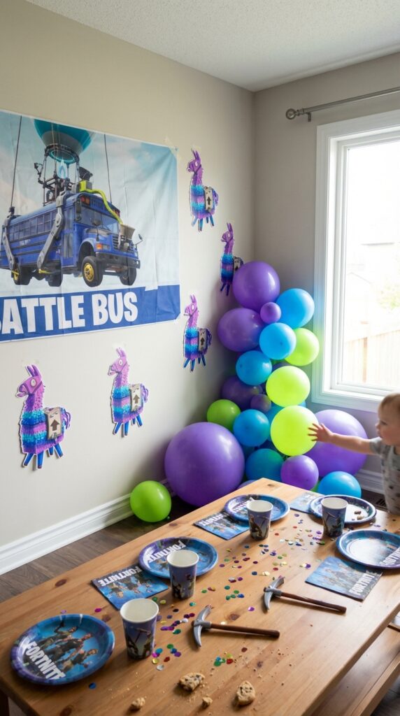 Decorations set the tone for any great party, and a Fortnite bash is no exception. Hang themed backdrops featuring iconic game elements like the Battle Bus or colorful loot llamas to instantly alter your space. You’ll want bright, bold colors — think purples, blues, and greens — to capture that signature Fortnite energy.