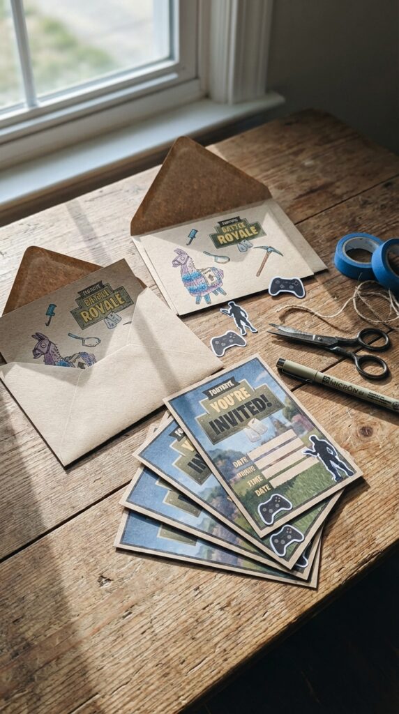 Sites like Canva or Etsy offer editable templates you can personalize in minutes. If you prefer physical invites, print them and slip them into custom envelopes decorated with Fortnite-themed stickers or stamped designs. Either way, set the battle bus theme early so guests know exactly what kind of party they’re walking into.