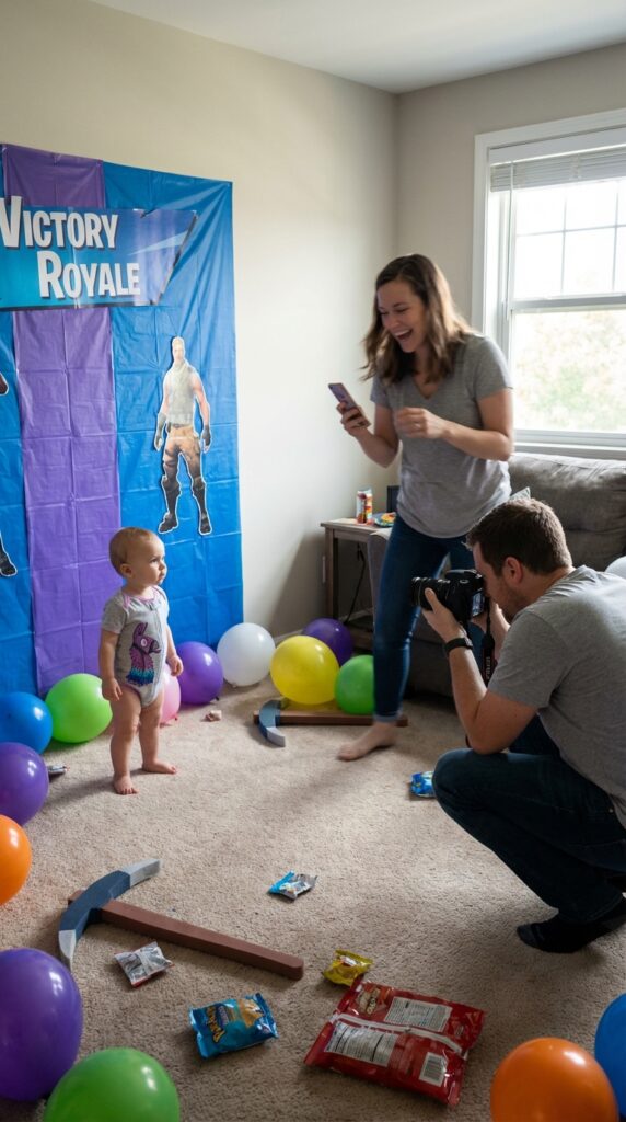 Now that your decorations are locked in, it’s time to think about capturing all those priceless birthday memories. Set up a Fortnite-themed photo booth with props like cardboard pickaxes, llama cutouts, and Victory Royale signs. You’ll capture epic gameplay moments-style photos your little one will treasure forever.