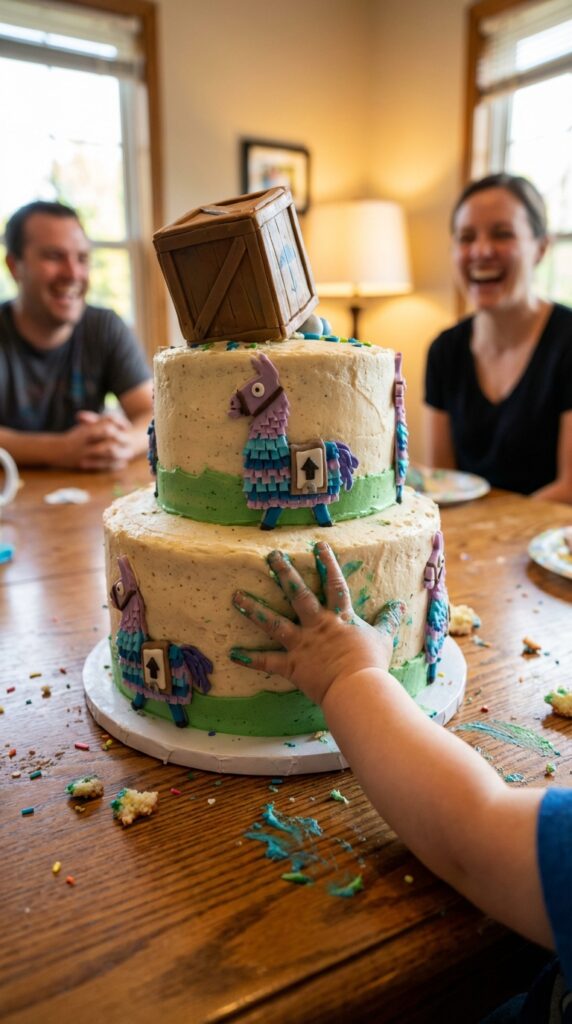 Once you’ve nailed the decorations, it’s time to tackle the centerpiece every one-year-old deserves — the cake. Go bold with Fortnite-themed fondant decorations shaped like llamas, supply drops, or pickaxes. These edible details instantly alter a basic cake into something spectacular.