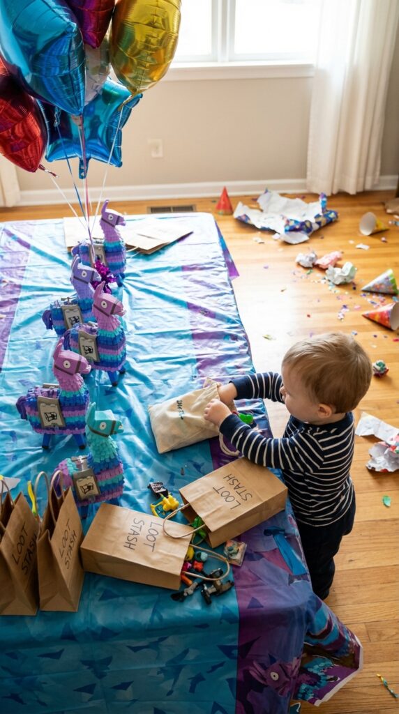 Fill small drawstring bags with these goodies for an easy, organized setup. Want something extra special? Consider customized party favors like personalized keychains or mini loot llama figurines with each child’s name. These small touches make guests feel valued and give them a memorable keepsake from the celebration. For even more inspiration, loot bag ideas can help you discover creative party favors that guests will love taking home after the battle.