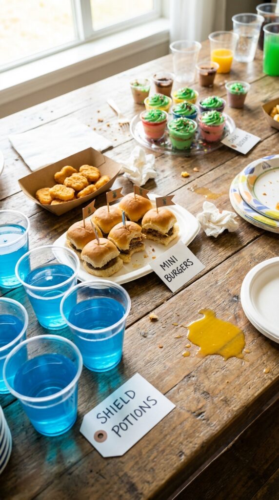 Think themed bites that look impressive but don’t stress you out. Fortnite inspired finger foods like mini sliders, chicken nuggets shaped like llamas, and veggie cups labeled “Shield Potions” keep things fun and manageable.