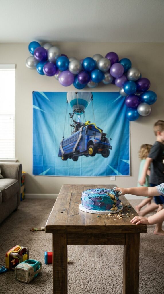 Add a balloon cluster above it all, and guests won’t know where to look first. It’s organized chaos done perfectly. For an even more immersive look, consider adding Fortnite table centerpieces inspired by the battle royale theme to tie the entire display together.
