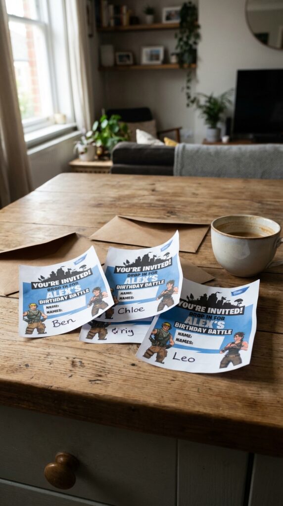 The invitation sets the tone before a single decoration goes up — and for a Fortnite-themed party, you’ve got a real opportunity to get kids buzzing weeks in advance.