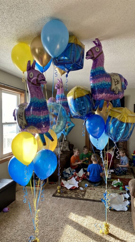 Once you’ve got that Battle Bus backdrop locked in, it’s time to build up the rest of your decor — and balloons are where things get really fun. Grab inflatable Fortnite balloons shaped like llamas, shields, and supply drops to scatter around the party space. They instantly make the room feel like you’ve dropped straight into the game.