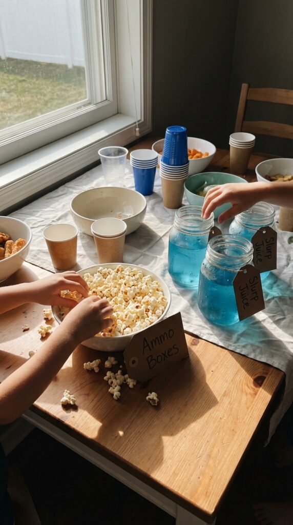 Every great Fortnite party needs snacks and drinks that match the energy of the game, and trust me, this is where you can really have fun with the theme. Label your fun shooter snacks with names like “Ammo Boxes” for popcorn and “Med Kits” for Rice Krispie treats. Kids absolutely love the creative touch.
