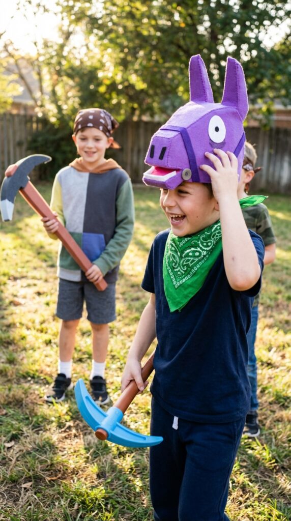 You don’t need expensive full outfits. Simple costume accessories like llama hats, bandanas, and pickaxe props convert any kid into a Fortnite character instantly. Pair those with your themed party decorations, and everything clicks together beautifully.