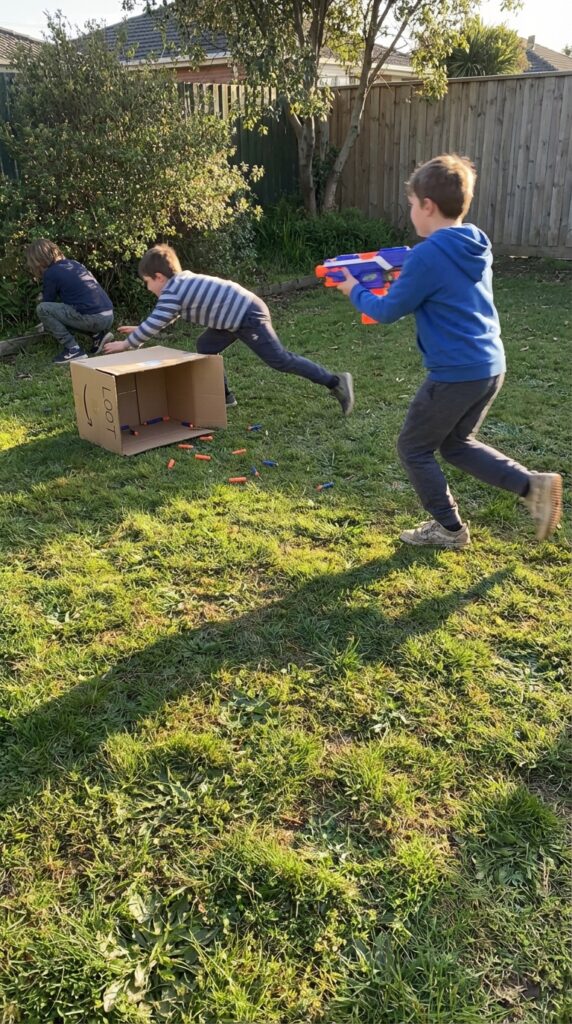 Set up multiplayer challenges like nerf gun elimination rounds where players collect cardboard “loot” after tagging opponents. It keeps everyone moving and mirrors actual gameplay mechanics.