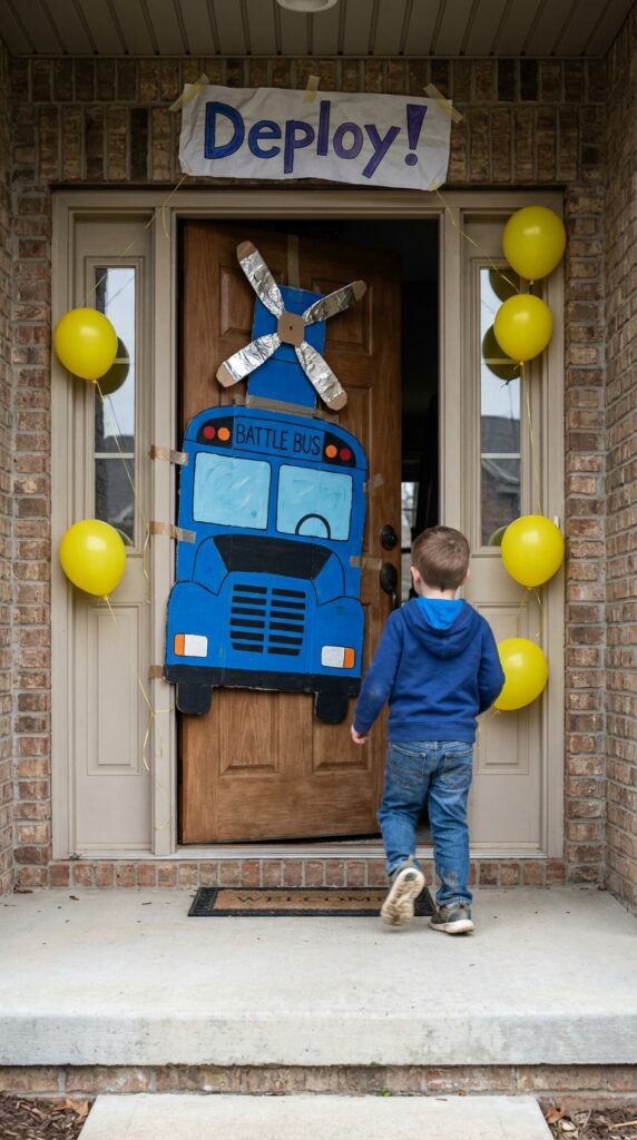 When you’re throwing a Fortnite-themed birthday party, the entrance sets the whole vibe — and nothing screams Fortnite louder than a Battle Bus moment. Alter your doorway using themed battle bus decorations like a giant blue bus cutout, yellow balloons, and a propeller prop hanging overhead. Kids will lose their minds walking through it.
