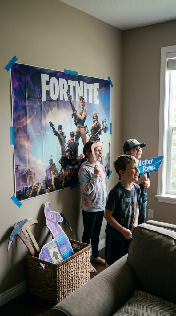 Print a simple Battle Bus backdrop, hang it against any wall, and you’re basically done. An interactive fortnite photo booth works best when kids can swap props freely, so keep everything within reach. Trust me — you’ll end up with hilarious shots that’ll outlast any party favor.