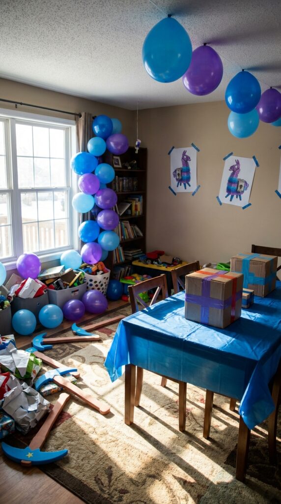 Want to go all out? Create a realistic battle bus entrance with a hanging banner that reads “Deploy!” right above the door. It’s simple, budget-friendly, and instantly recognizable. Trust me — that entrance photo alone will make the whole party worth every bit of effort. For even more memorable shots, consider designing a Fortnite-inspired backdrop near your cake table to give guests a dedicated high-energy photo spot that ties the whole theme together.