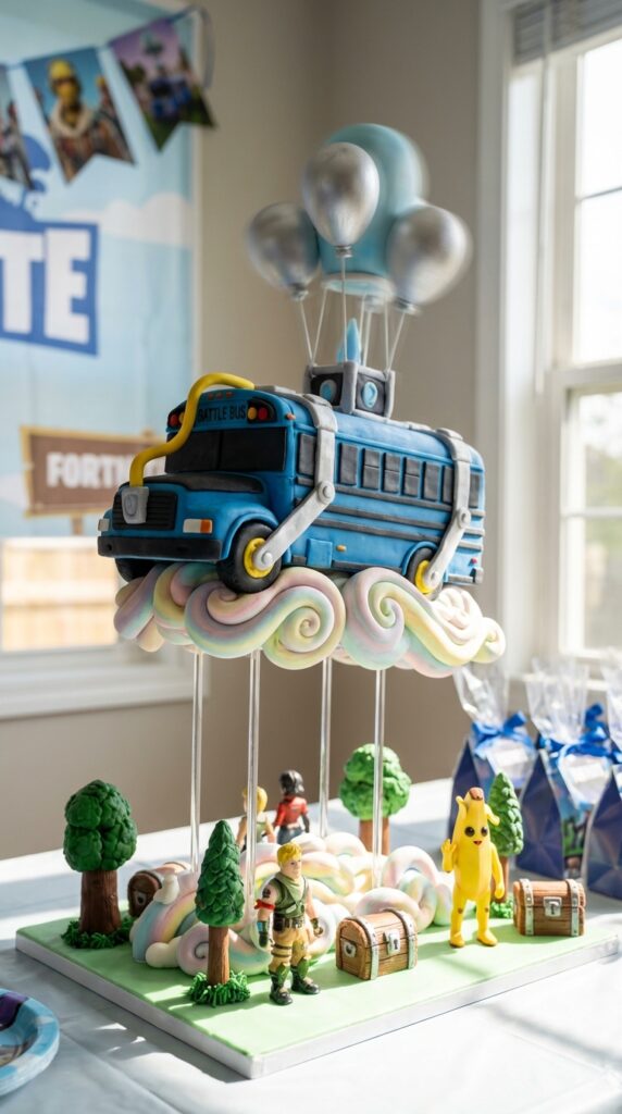 The Battle Bus cake is one of those designs that’ll make every Fortnite fan at the party do a double take. You’ve got several battle bus design variations to choose from, including fondant-covered sheet cakes or sculpted 3D versions.