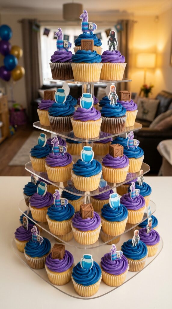 Cupcake towers are honestly one of my favorite cake alternatives for Fortnite parties, and here’s why they work so well: each guest gets their own frosted piece without the awkward cake-cutting chaos.