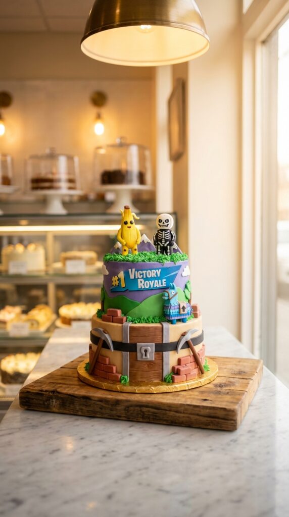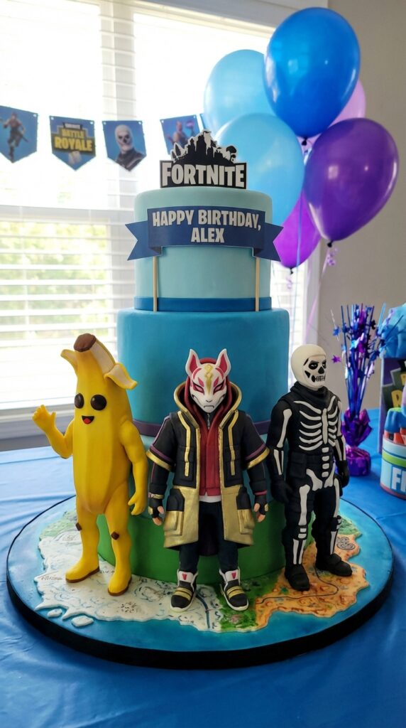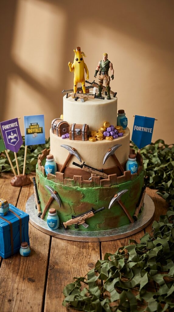 Each level tells a different part of the game’s story. Crown the top with themed cake toppers like Victory Royale signs, tiny pickaxes, or miniature gliders. These details convert a simple cake into a full centerpiece.