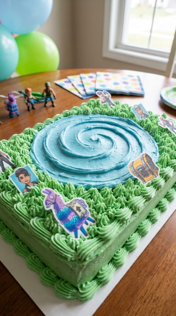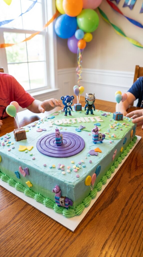 Victory Royale sheet cakes are honestly where most Fortnite parties find their sweet spot — they’re easier to serve than sculpted 3D cakes, and kids absolutely lose their minds over them anyway. You can load the flat surface with colorful fondant designs featuring storm circles, loot llamas, and supply drops.