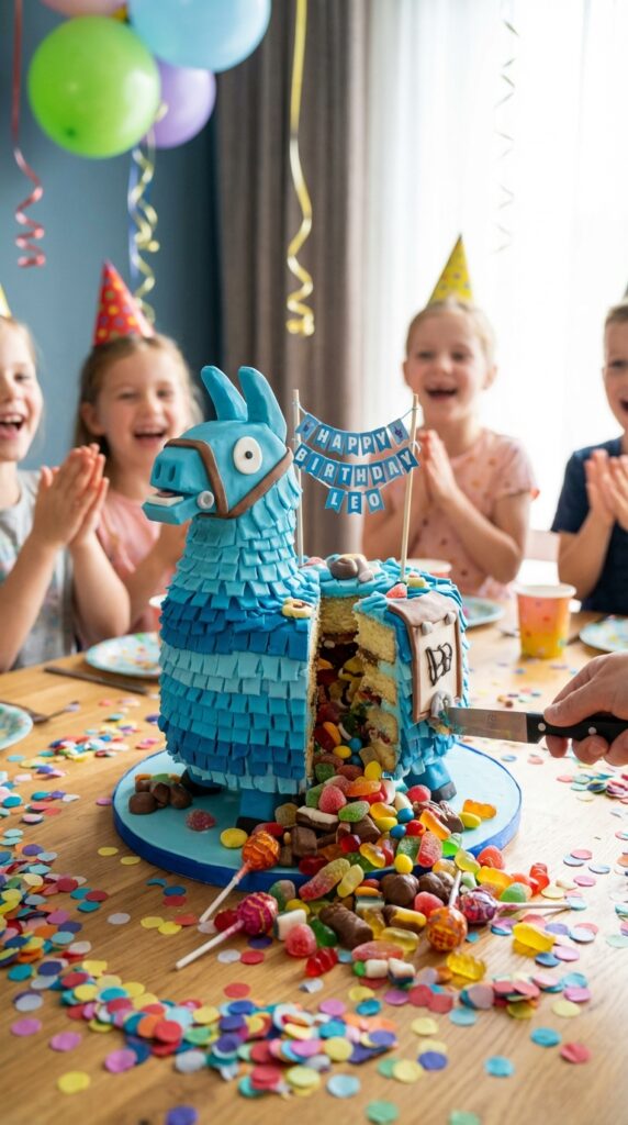 Fortnite llama piñata cake designs typically feature the game’s iconic blue llama shape with colorful fondant detailing. You can personalize everything using customizable llama piñata cake toppers, adding the birthday child’s name or favorite character. The reveal moment creates pure excitement. Kids scream when candy spills out — honestly, it’s the highlight of any Fortnite-themed celebration. Pairing the cake with a Fortnite-themed party setup pulls the entire decorative vision together and makes the celebration feel fully immersive.
