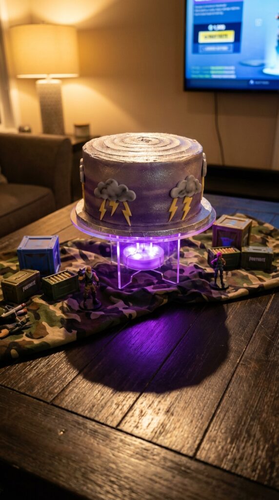 Few cake designs in the Fortnite universe hit as hard visually as the storm circle cake, and once you see one lit up with purple LED lights, you’ll understand why. You’re fundamentally recreating that terrifying purple wall closing in on players — except this version’s delicious.
