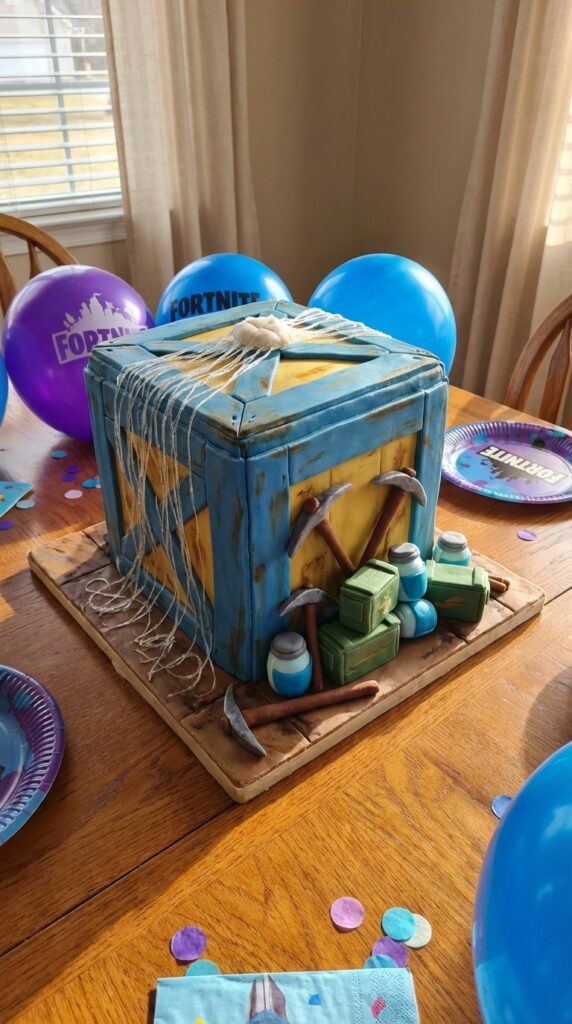 For supply drop cake embellishments, consider adding fondant loot items spilling from an open crate side. Weapons, shield potions, and ammo boxes make perfect details that every Fortnite fan immediately recognizes and appreciates. To complete the party aesthetic, coordinate your cake with supply drop balloon clusters arranged nearby for a cohesive and immersive Fortnite display that ties the entire celebration together.