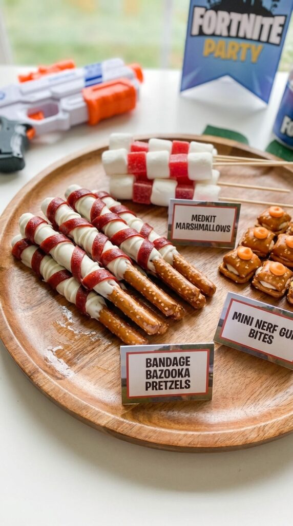 Everyone loves a good pretzel rod, and dipping them in white chocolate gives you the perfect base for a Bandage Bazooka alteration. Once the chocolate sets, wrap red candy strips around each rod to mimic the iconic in-game weapon. They’re surprisingly easy to make and look incredible on your snack table.