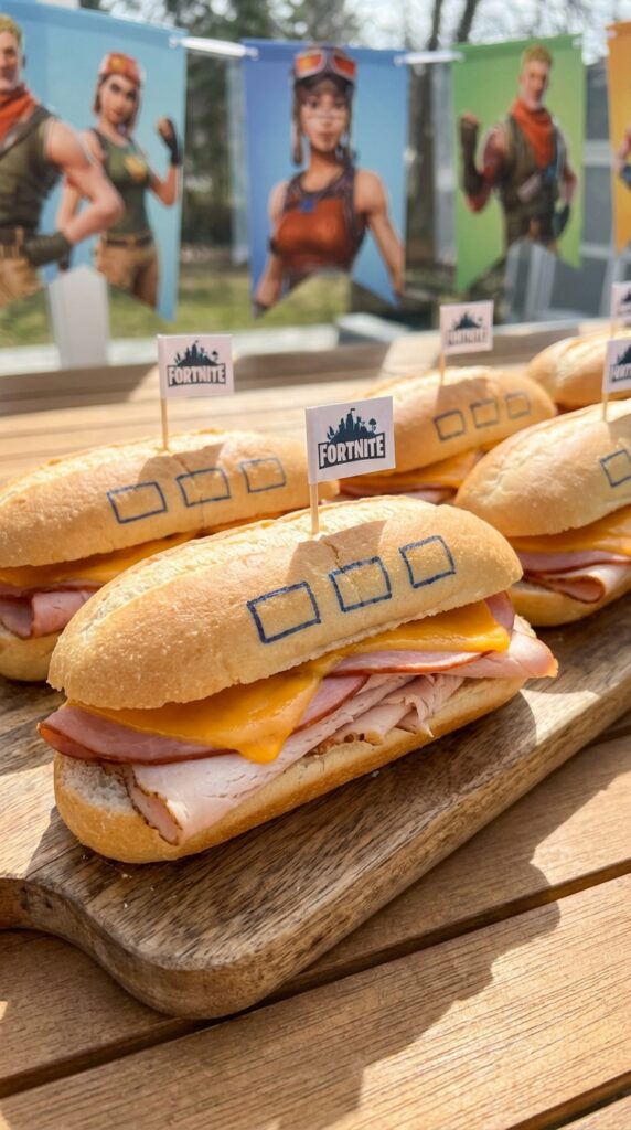 Nothing screams Fortnite party quite like a Battle Bus sandwich roll cruising across your food table. Grab hoagie rolls and stuff them with your kids’ favorite fillings — turkey, ham, or even meatballs work great.