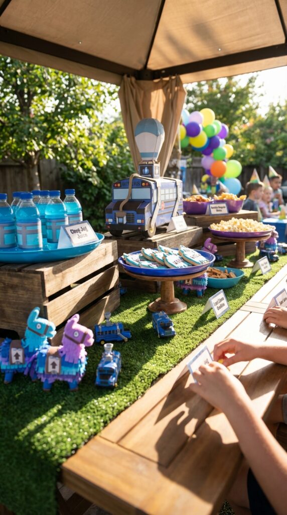 For adult guests, investigate unique alcoholic cocktail ideas — blue curacao mixed with vodka and sprite works beautifully. Set up a self-serve station so everyone grabs their own. Trust me, it becomes the most photographed spot at the party. Pair your drink station with Fortnite table centerpieces to tie the whole battle royale theme together and create a cohesive, immersive party setup.