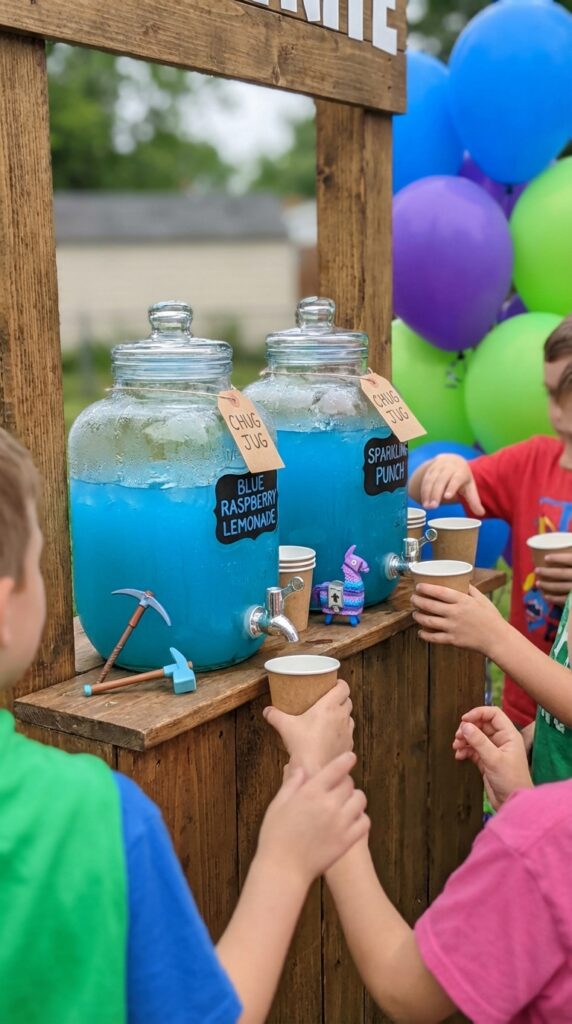 Every Fortnite party needs a signature drink station, and the Chug Jug is the perfect inspiration — it’s literally the most powerful healing item in the game, so it carries some serious party street cred. Fill large blue jugs with invigorating beverage options like blue raspberry lemonade, coconut water blends, or sparkling fruit punch. Label everything with Chug Jug tags for instant recognition.